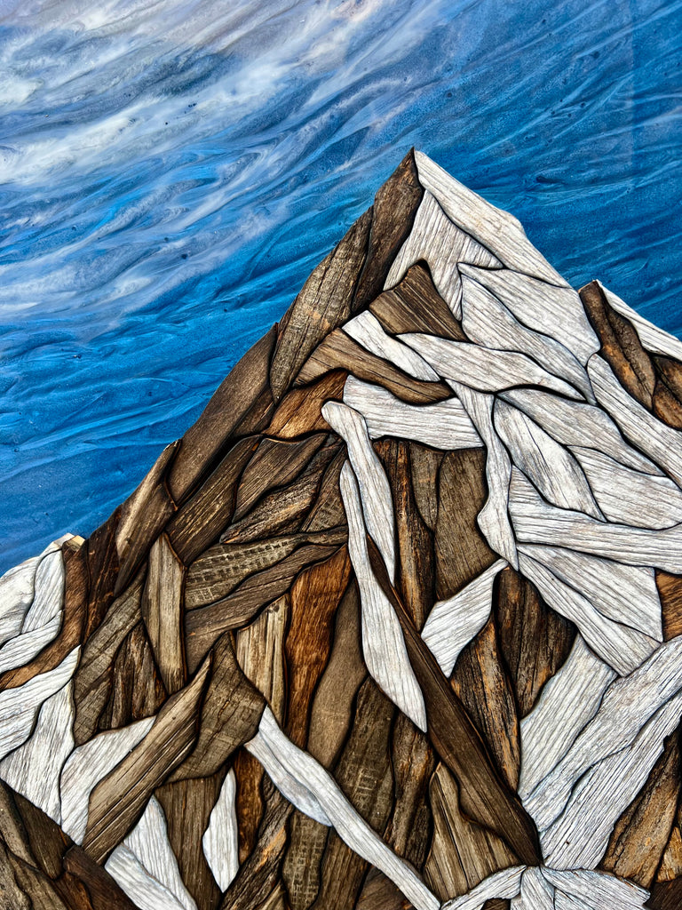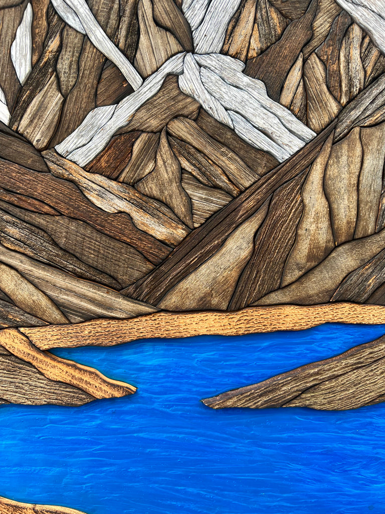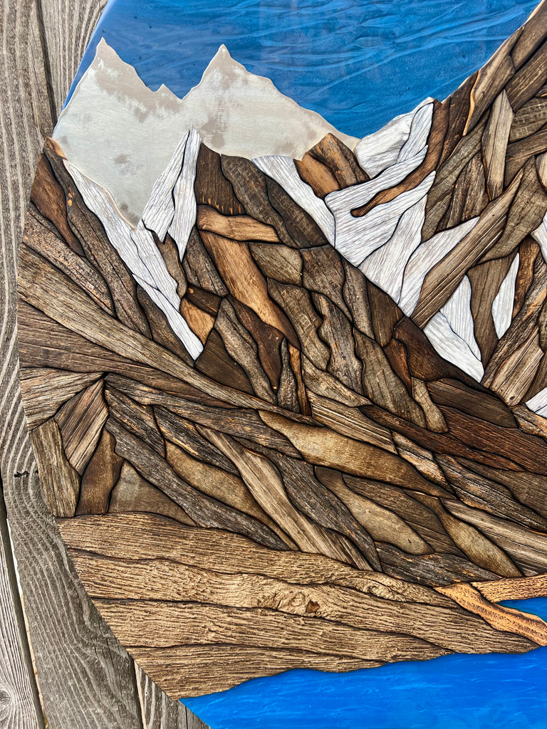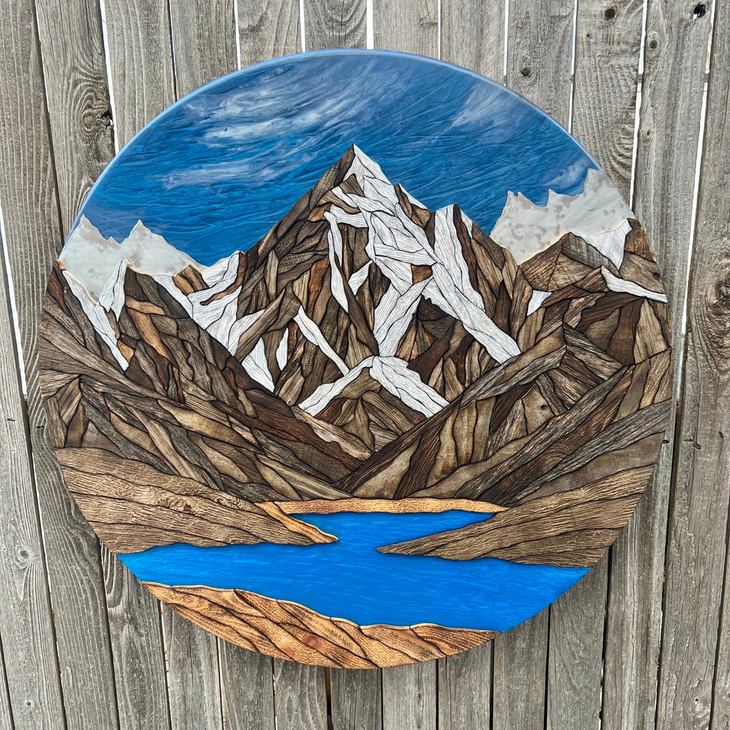 This piece reflects more than a decade of passion for woodworking and honing my skills. Each element has been thoughtfully cut, shaped, and fit by hand, utilizing reclaimed barnwood (some over 100 years old), cedar, and steel, with every piece selected for its weathered character and rich natural tones. The majestic peaks rise in deep earthy hues, contrasting beautifully with sharp snowcaps, while a serene alpine lake and blue sky are brought to life through epoxy resin. The layered combination of wood, steel, and resin creates a unique 3D effect that captivates the eye.