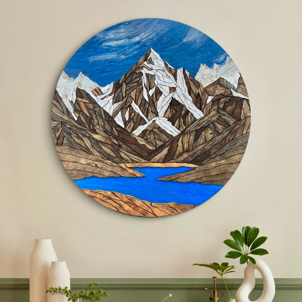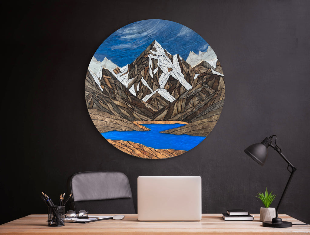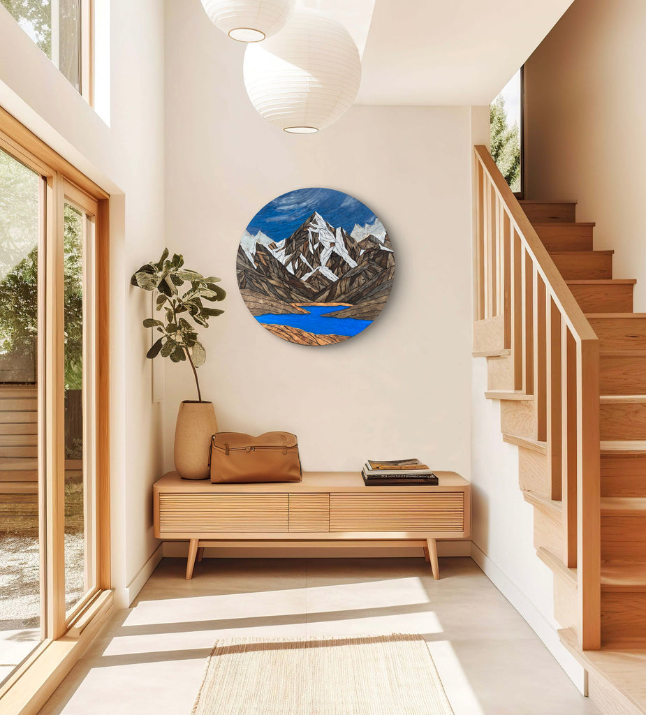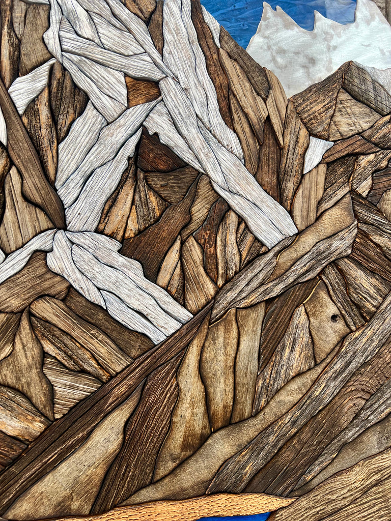 This piece reflects more than a decade of passion for woodworking and honing my skills. Each element has been thoughtfully cut, shaped, and fit by hand, utilizing reclaimed barnwood (some over 100 years old), cedar, and steel, with every piece selected for its weathered character and rich natural tones. The majestic peaks rise in deep earthy hues, contrasting beautifully with sharp snowcaps, while a serene alpine lake and blue sky are brought to life through epoxy resin. The layered combination of wood, steel, and resin creates a unique 3D effect that captivates the eye.