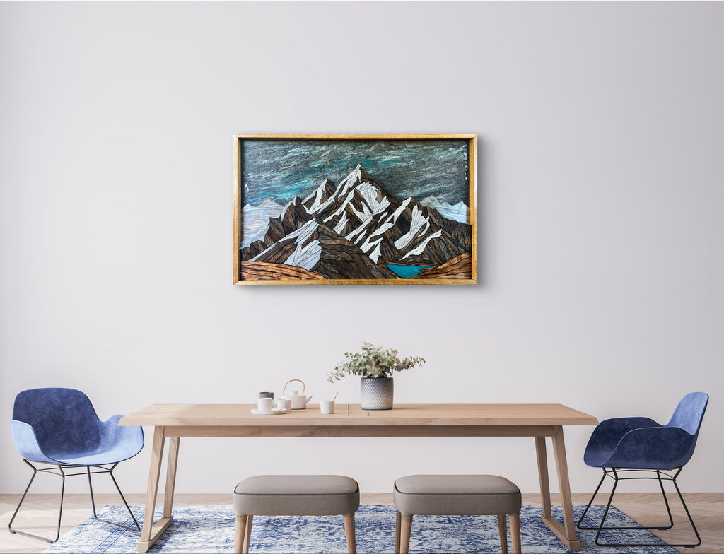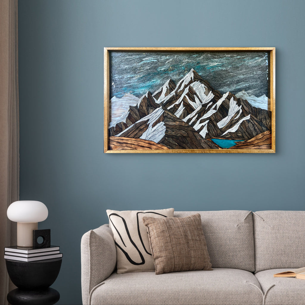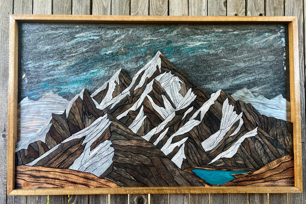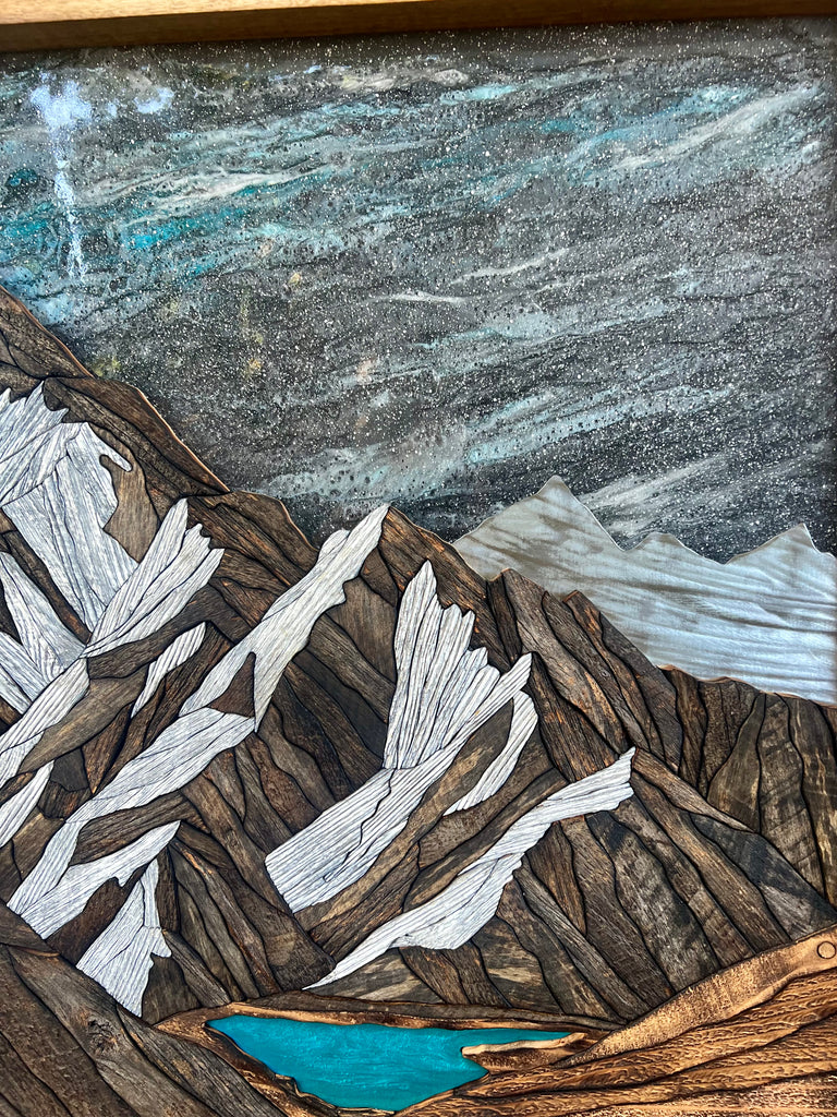 This piece took over 100 hours to build, and reflects more than ten years of learning and refining my craft. Every piece was cut, shaped, and fit by hand using reclaimed barnwood, cedar, and steel. Each piece chosen for its weathered character and natural tones. The peaks rise in deep earthy contrast to sharp snowcaps, with a turquoise lake and starry sky poured in epoxy resin to really bring it all to life. Layered wood, steel, and resin give it a truly unique 3D feel.